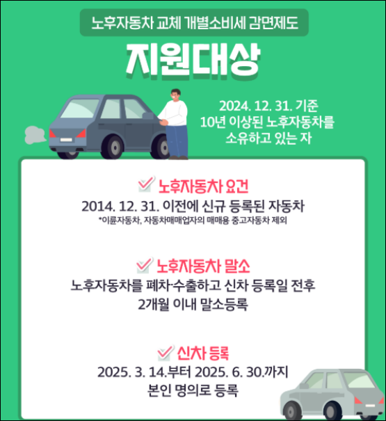 2025년 상반기 내에 신차를 구매하려는 분들이라면 반드시 알아두셔야 할 노후자동차 교체 시 개별소비세 감면 제도의 요건과 절차를 정리해드립니다.